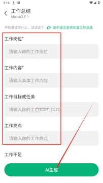 3、比如点击工作总结,输入工作岗位和工作内容等信息,点击AI生成即可
