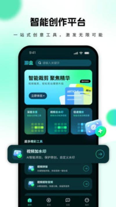 游盒app是一款视频智能创作平台手机软件,这里有一站式的创意工具提供给你使用,激发无限可能,任意工具素材免费去获取,直接就可以打造个性视频效果,手机去进行视频创作分享更容易,输入关键词就可以搜索想要的内容,都会为你全面提供的。