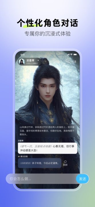 - 剧本闯关玩法:化身主角,进入丰富多样的剧情世界!是斗智斗勇的密室逃脱,还是冒险奇幻的修仙之旅?我们的剧本闯关功能支持多样特色场景,你可以扮演多重身份,与AI角色互动推进故事,解锁独特结局,完成你的每一段冒险旅程。