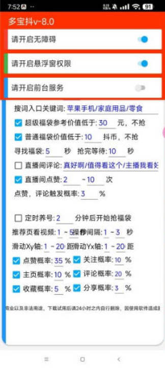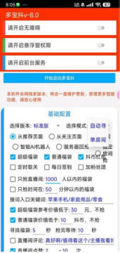 多宝抖V8.0可帮助用户在手机息屏状态下抢大量的福袋,推出的一切系统工具均会免费展现,打开前台服务之后,就可调整各种抢福袋的参数,有三个技巧可以了解一下,需要确定好活动开启的时间和具体的位置,能不间断的刷新页面,更好的锁住福袋开放的时间点,把抢福袋的各类标签进行分组处理,会提高抢福袋的准确度。