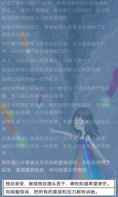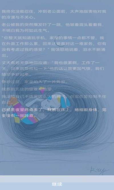 这是一款角色扮演类游戏,在游戏中您将扮演一位抑郁症患者在七天中的经历,在游戏情节和选择项中您将体验抑她(他)们的真实情感,我们希望能帮助更多人了解抑郁症,抑郁症并不可怕,我们需要的更多是倾听、理解和陪伴。