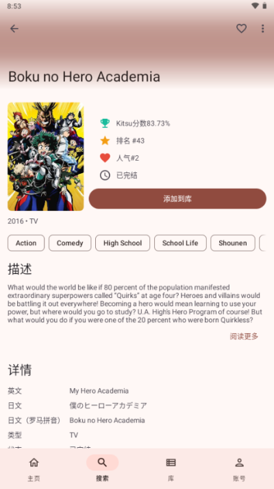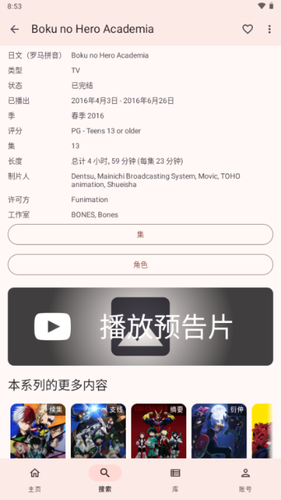 2.点击即可查看动漫和漫画详细信息,包括剧集,章节等。