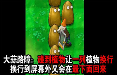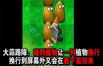 1、大蒜路障:碰到植物让一列植物换行,换行到屏幕外又会在最下面回来。