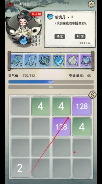 玩家需要通过滑动屏幕,将相同数字的方块合并,最终合成目标数字(如2048)。每次合并都会提升修为,解锁新的境界和技能。