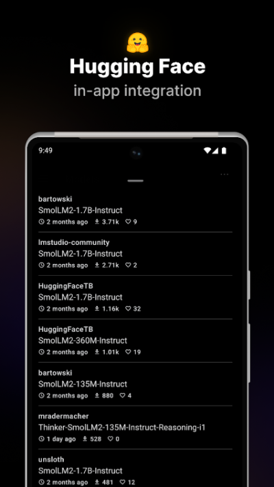 Hugging Face 集成:直接在应用内搜索 GGUF 模型,支持收藏或下载。