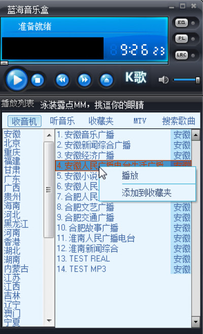 蓝海音乐盒是一款非常好用的音乐播放软件,除了拥有一般音乐播放器常用的功能外,还支持网络收音机,有全国各地区上百个电台频道,支持在线音乐搜索和播放,播放MTV、K歌等功能。