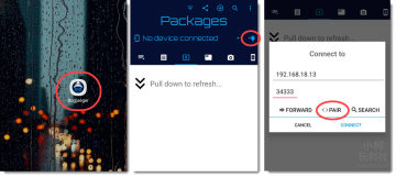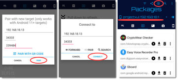 请依手表上出现的配对码输入; 再按 PAIR → 此时再对照一下手表及手机上的 Port 号是否相同,再按 Connect 。 只要看到中间的蓝子字串上出现 192.168 开头的数字即代表已连线成功。 若要传送 APK 到手表上,请按屏幕顶端的+ 图案