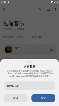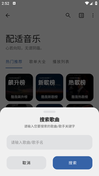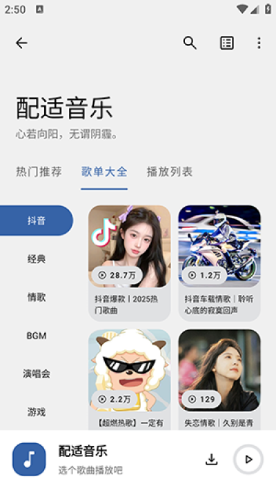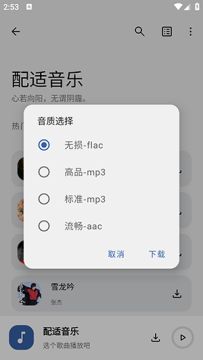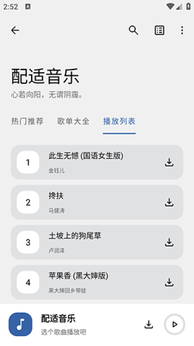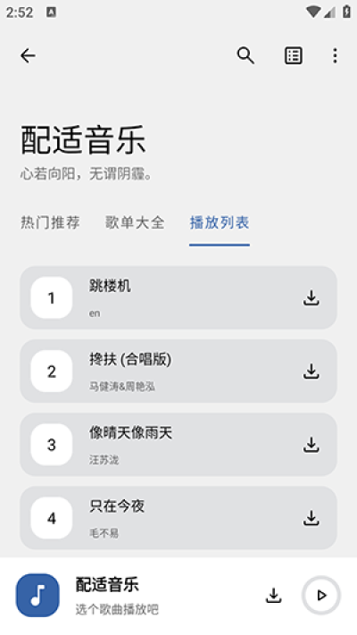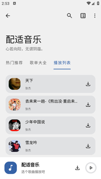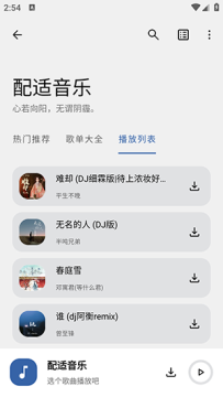 配适音乐APP听音乐下载音乐神器,无任何的广告,不需要登录就可以直接使用,非常方便的听歌,下载无损歌曲的神器,软件界面清爽好用,多种歌单可以随意选择切换和播放,喜欢听歌,爱好音乐的朋友必备。