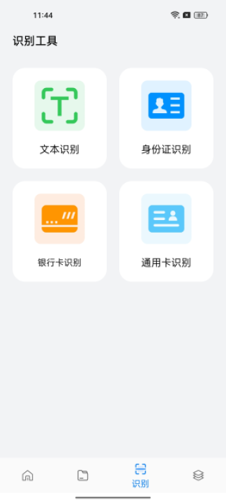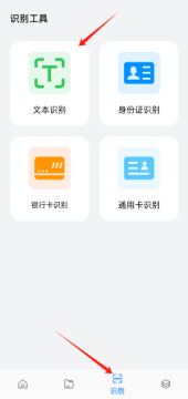 3、我们点击下方的识别可以发现这里有丰富的识别工具可以使用,比如文本识别、通用卡识别等等