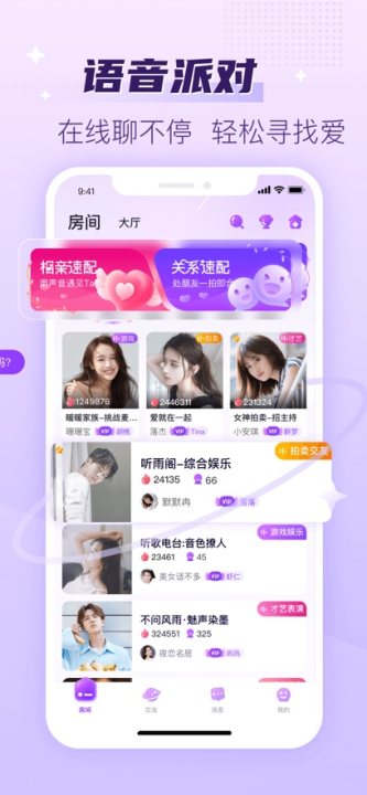 相亲房派对、陪聊房、k歌房等个性化房间,等你来参与。