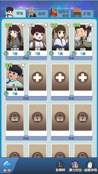 《全民学霸》作为学校的经营者,不仅要需要考虑招募品质各异的教学老师、培养各色学生等等多种因素,最重要的是布局校园设施、进行课题挑战,宣传扩张,雇人提升老师技能,参加知识大赛.....