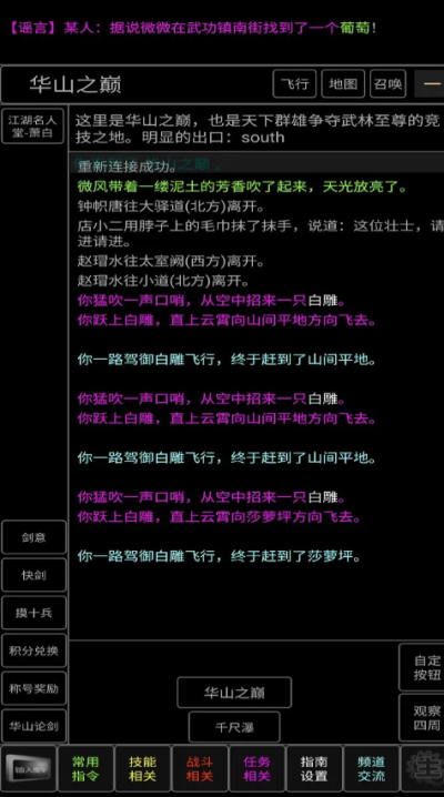 这个时候你点战斗相关,点击选择,点击八方风雨,跟老虎战斗的时候记得用,具体用法就是点战斗相关,然后点八方风雨,等你打败老虎,你就往右走,直接爬上去,然后再回到山庄找庄主,再问他闯荡江湖,然后你再一路一直向上,来到藏书阁,点击书架,点击取下来,再点击书架,再点读一下,然后你再向庄主问闯荡江湖,他就会在杏子林等你,就一路向下,来到大门,在山庄大门下面两步,左面一步就是杏子林了,然后你向下走,他屏幕上就会出现一串指令,然后你点击,就能往下走了,你也可以在左下角的输入指令里输入chat* bye you(点车马行也会提示你输入指令)。然后你点那个招牌上马车就好了