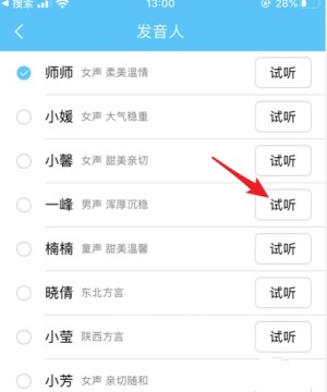 4、点击后在页面中,选择试听的选项,音箱就会播放该发音人的声音。