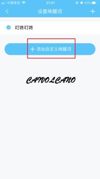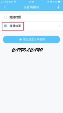 3、默认的唤醒词是叮咚叮咚。点击添加自定义唤醒词。
