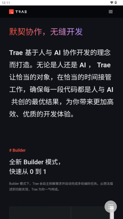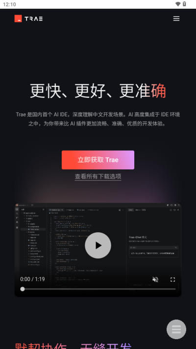 trae是一款由字节跳动推出的ai中文ide工具,软件中有着海量的实用功能等你体验,用户可以随时随地在线体验,在这里可以体验智能ai的各种功能内容,操作起来非常方便!对软件感兴趣的话不妨点击下载试试!