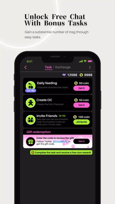 - 免费人工智能聊天:想免费聊天吗? Crushon AI 提供一系列奖励任务。完成邀请好友、每日签到、创建角色等任务,即可获得无限免费聊天资源!