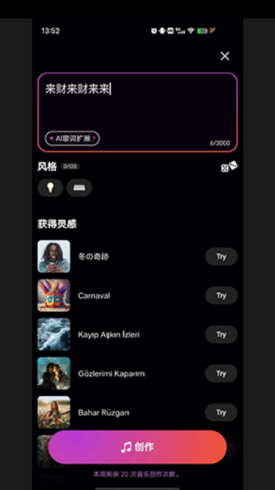 灵感曲库探索:Waazy拥有丰富的AI音乐曲库,每首曲目都是激发新灵感的源泉。你可以发掘新声音,重制旧曲,创造独一无二的音乐作品。在这里,创作无界,灵感无限。