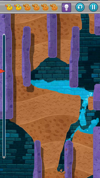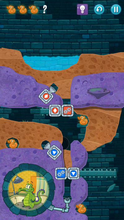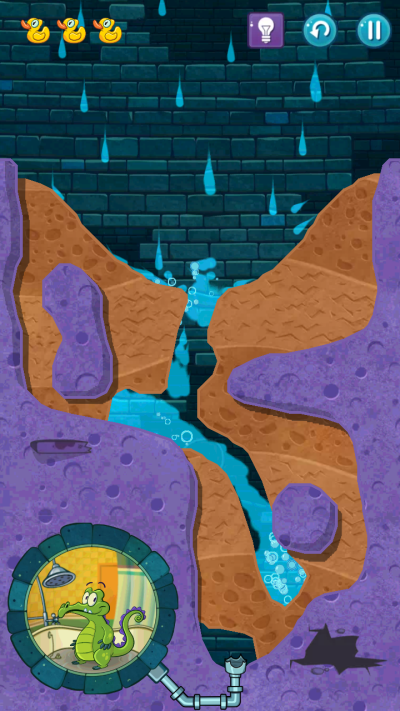 3、清水会去开启蓝色机关,这里设置好一个U型通道去收集好鸭子,等鸭子收集好后,划开泥土让清水进入小顽皮屋子就可以。