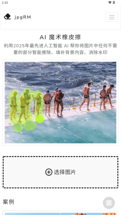 jpgRM是一款由jpgRM公司开发的AI图像处理工具,专注于通过先进的人工智能技术,轻松移除图像中不需要的物体、标志、人群和水印。该工具的目标用户包括摄影师、设计师、电商从业者以及社交媒体用户等,旨在帮助他们快速提升图像质量,满足特定的视觉需求。jpgRM的核心功能包括智能擦除物体、自动填充背景、去除水印等,其创新点在于利用AI算法实现高效、精准的图像处理。