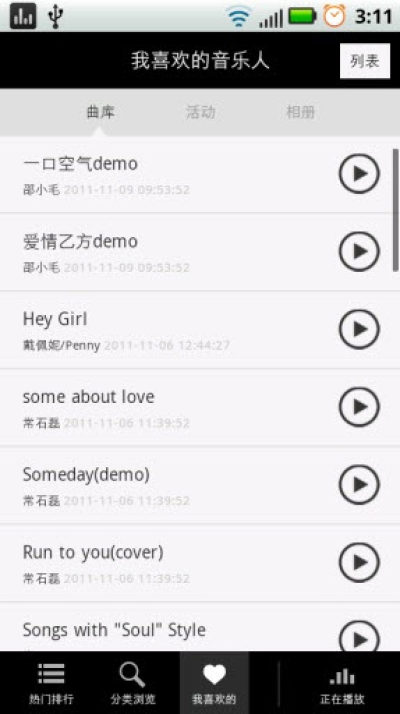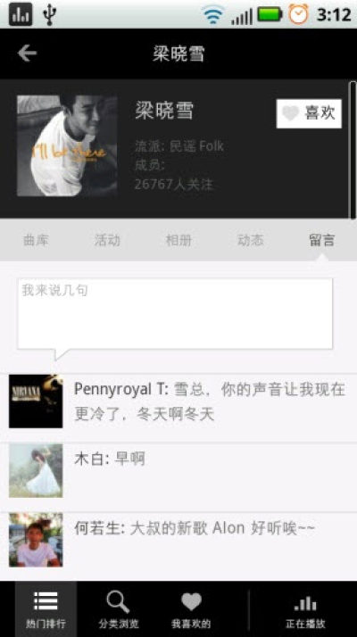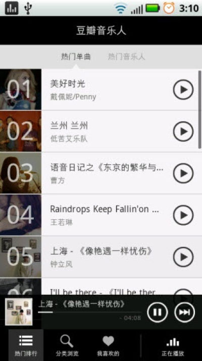 豆瓣音乐人是一款基于豆瓣API开发的手机音乐播放器,提供了豆瓣音乐人相关音频的播放功能。跟进音乐人的日常创作与演出讯息,收听他们最新上传的单曲,参与音乐人的互动并为他们留言,以及最重要的,发现你身边更多有趣的音乐人!