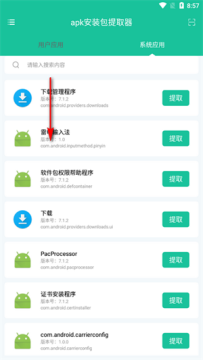 清晰易用的UI设计:APK安装包提取器具有简洁的用户界面风格。打开应用后,已安装程序的名称会直接显示,版本号以红色字体呈现,方便用户快速识别和管理应用。