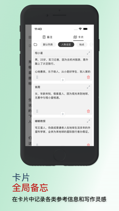 全局卡片列表:可记录各种随时需要翻看的信息或灵感,便于写作时参考。