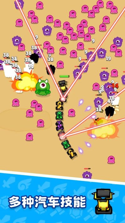这是一款Rougelike(肉鸽)游戏,每个车有一种主炮,可以在战斗中升级车炮的技能,车队可以通过科技线和局内技能升级。荒野中小怪不停围攻,消灭掉所有小怪即可通关,后面关卡会出现各种BOSS,请务必小心。