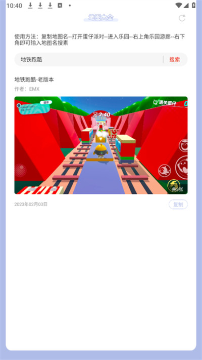 蛋仔派对地图大全下载安装最新手机版是一款专为《蛋仔派对》游戏爱好者精心设计的地图资源集合工具。该应用汇集了网络上最新颖、最全面的精选地图,包括热门地图、经典老六地图以及独特的小众潮流地图等,例如“比奇堡危机”、“香菜狗的玩具世界”、“地铁跑酷”等多样化的地图资源。用户只需轻触屏幕,即可轻松浏览和选择心仪的地图进行游戏。对于追求新鲜游戏体验和喜爱探索新地图的玩家来说,这款应用无疑是一个不可多得的宝库。感兴趣的玩家们,赶快下载体验,开启您的蛋仔派对新旅程吧!
