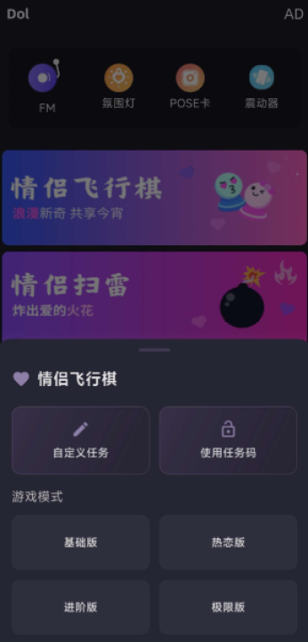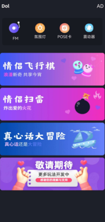 dol是一款专为情侣设计的情感升温工具,内含海量的实用功能以及趣味小游戏可以体验,包含情侣飞行棋以及扫雷等,还可以一键开启氛围音乐以及灯光等,异地远程也可以遥控操作,对软件感兴趣的话不妨点击下载试试!