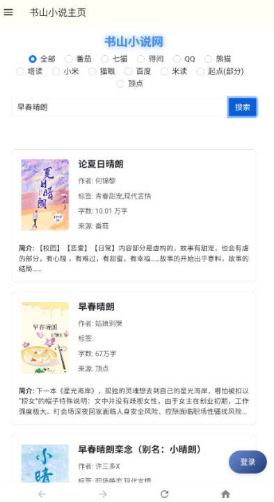 书山小说网是一个综合性的小说阅读平台,整合了多个知名小说平台的资源,包括番茄小说、七猫小说、得间小说、QQ阅读、熊猫小说、塔读文学、小米小说、猫眼小说、百度小说、米读小说和起点中文网等。用户可以在一个平台上轻松浏览和阅读来自不同来源的小说,无需在多个应用之间切换。