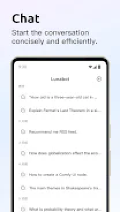 Lunabot是一款安卓手机ai智能助手软件,软件中有着海量的实用功能等你体验,用户可以选择不同的功能进行使用,可以随时进行问答对话,还可以快速进行内容创作,快速处理各种任务提高您的工作效率。对软件感兴趣的话不妨点击下载试试!