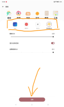 3、在界面第二排区域左右滑动,选择你喜欢的图标包,根据你的喜好选择图标大小和应用名称大小,点击应用;