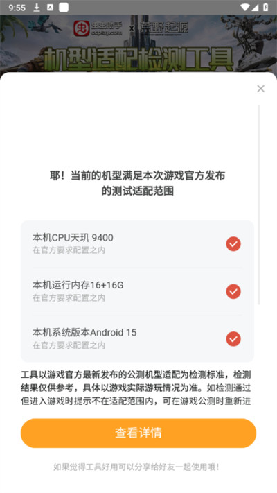 官方标准:此工具依据游戏官方最新发布的公测机型适配标准进行检测,但结果仅供参考。