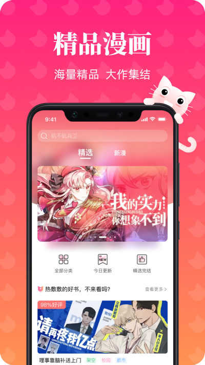 喵喵漫画拥有庞大的漫画资源库,涵盖日本漫画、韩国漫画、国产漫画等全球范围内的优质作品,无论是经典老作还是新锐佳作,都能在这里一网打尽,满足不同用户的阅读偏好。