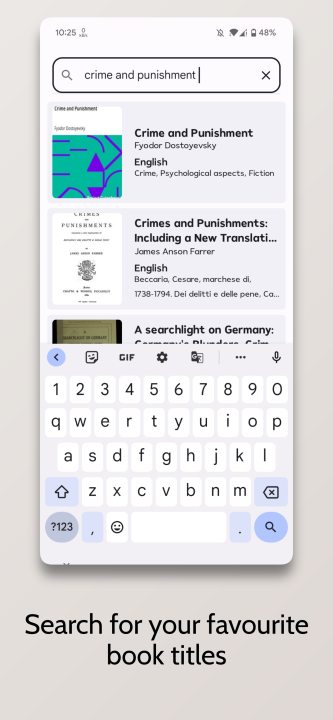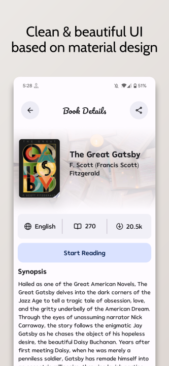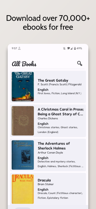该应用还利用 Google Books API 来检索其他数据,例如概要和页数。因为 Gutenberg 项目不将这些值包含在其元数据中。虽然该应用尝试将从 Google Books 收到的数据与 Gutenberg 的元数据进行映射,但映射并不总是 100% 准确。此外,并非所有 Gutenberg 上提供的书籍都可以在 Google Books 上访问,或者它们可能以不同的标题提供。因此,您可能会发现一些没有概要或页数等的书籍。