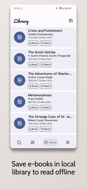 Myne是一款FOSS Android 应用程序,用于从Project Gutenberg下载和阅读电子书。它使用GutenDex API 在后端获取电子书的元数据。此外,它还可以用作 EPUB 阅读器,让您轻松导入并沉浸于您喜爱的 EPUB 书籍中!