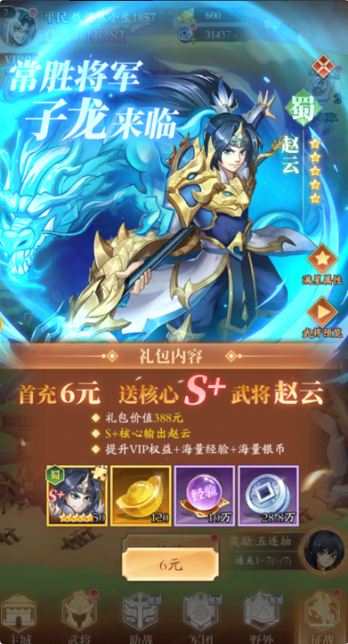 再就是最后的SSS武将,这个怎么说那,基本这个武将对低V不友好(V6可以直接得到一只)。60级后可以依靠每天20碎片来换取,VIP每周限购可以购买,如意商店可以如意元宝购买,活动免费兑换。如果你非要玩红的话,而且充值不多低于5000人民币的话,那就要忍受漫长的煎熬,因为红将基础强,技能强,但是所需的资源也是成倍的增加。