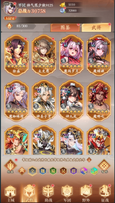 这游戏分S、SS、SS+SSS武将,如果你抽到S武将先不要分解,因为这个游戏讲求情缘,S级武将基本都是触发情缘,SS武将这个要说一下。很多玩家花了大量精力和资源去养SS级,目前来说的SS级,就是蜀国庞统、吴国陆逊、魏国郭嘉、群雄于吉、这四个值得培养,千万不要抽到一些你觉得他很厉害的武将就疯狂去养他。