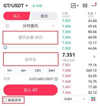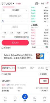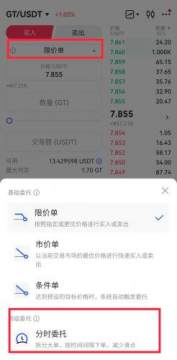 1、登录手机App现货交易页面,选择交易对后,点击“限价单”选择“分时委托”,以GT/USDT为例: