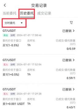挂单成功后,可在交易页面下方的【当前委托】-【分时委托】中,查看当前未完成的订单,已经完全成交或撤销的订单可在【委托历史】中查看,已成交的部分也可以在【我的成交】进行查看。