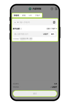 2、选择目的地【欧易接收账户】-选择通过【手机号/邮箱/子账户/UID】-输入/粘贴对方【手机号/邮箱/子账户/UID】-输入【数量】,点击【提交】。