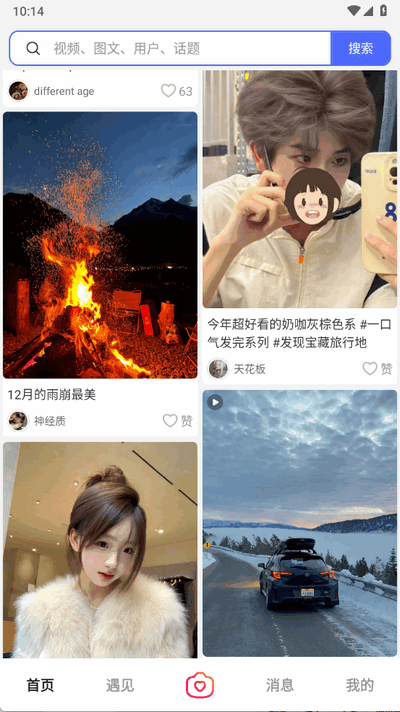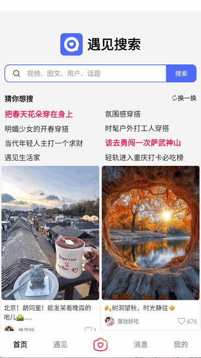 遇见搜索,生活全能助手!简单好用无广告。 遇见搜索是遇见集团旗下内容搜索引擎,定位于向用户提供简单高效的搜索结果;拥有精选视频、海量笔记、热门话题等,更多功能等你一起来探索,发现世界的美好。