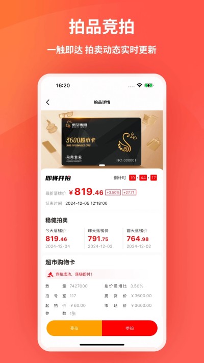 出价竞拍:输入出价金额,确认后参与竞拍。