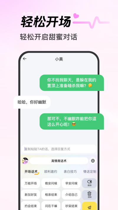 从初次约会的羞涩试探,到日常聊天的轻松闲谈,再到特殊节日的浓情蜜意,心动恋语精准匹配各类聊天场景,全方位覆盖,确保对话热度不减,让您在不同场合都能自信从容地与他人畅快交流,不再为聊天冷场而担忧。
