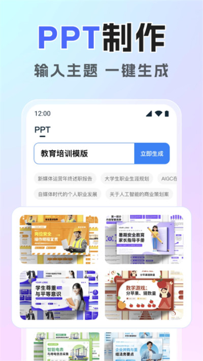 4、在PPT生成页面,只需要输入主题就能快速找到合适的PPT模板。