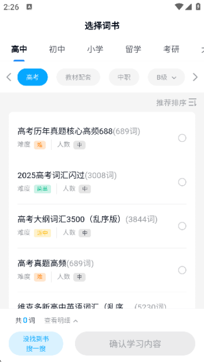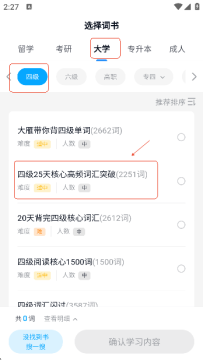 例如要考大学四级的用户可以选择,四级中的“四级25天核心高频词汇突破”词书