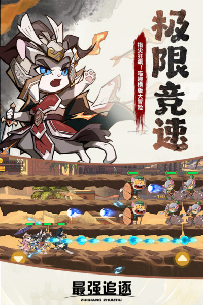 《最强追逐》是一款以萌元素的跑酷冒险弹幕射击游戏,玩家将组建萌猫队伍,穿越各种历史场景,收集宝物,击败敌人,解锁新角色,体验一场速度与激情的冒险。