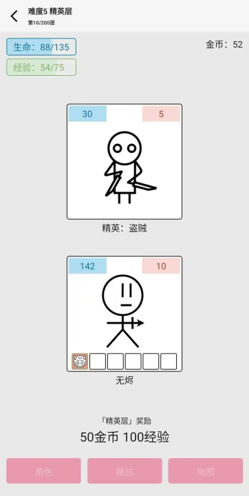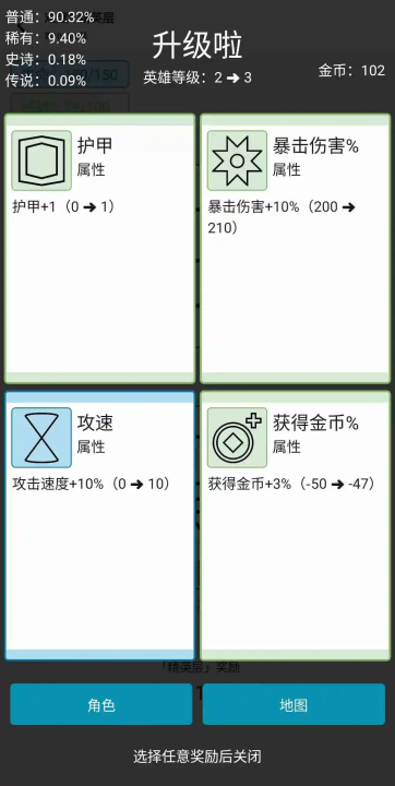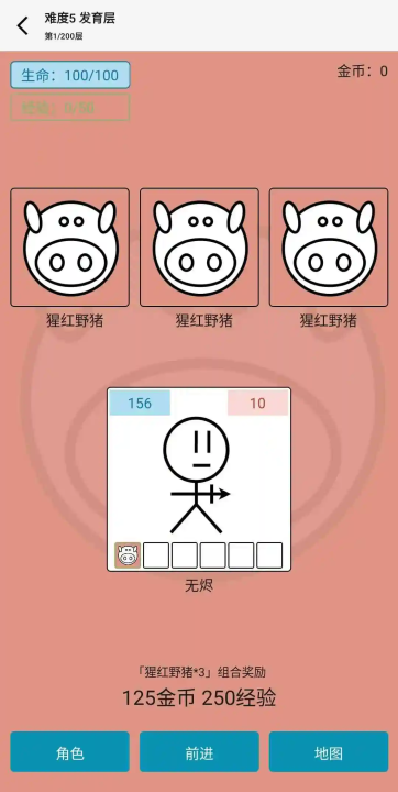 4. 关卡冒险:点击“前进”闯关,收集金币和经验,每个关卡有不同的奖励与组合。