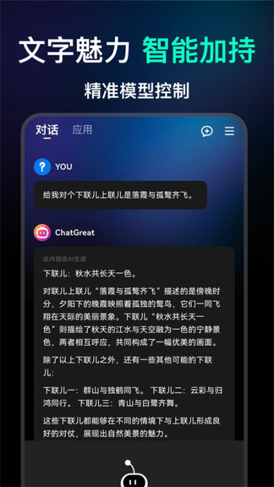 ChatGreat中文版智能AI软件是一款功能强大的人工智能软件,软件通过学习用户偏好和使用习惯,提供个性化的服务和建议,还支持多语言互译服务,帮助用户跨越语言障碍进行交流与写作,提供丰富的免费资源满足用户日常工作学习中的多种需求,支持跨端互通,用户可在手机电脑等设备间无缝切换使用!