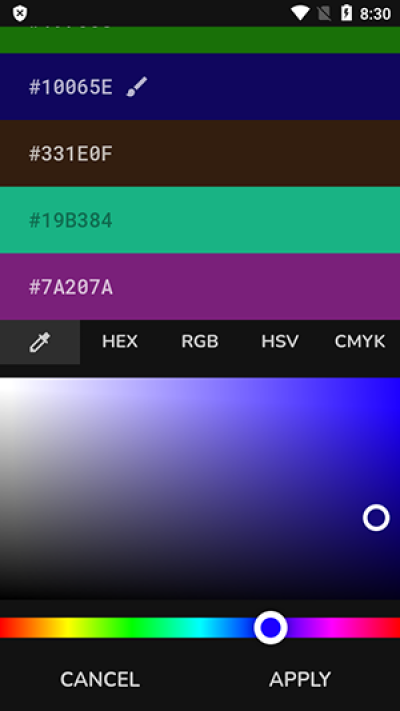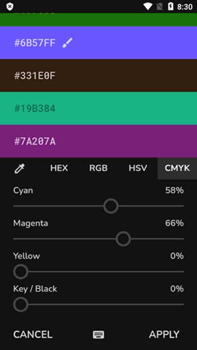 3、可调节颜色-通过使用视觉颜色选择器或使用HEX、RGB、HSV或CMYK滑块/数字输入来调整各个颜色。